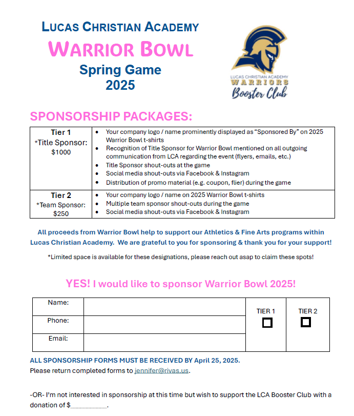 Sponsorships are valid and run for the duration of the Lucas Christian Academy academic calendar year of August-May.